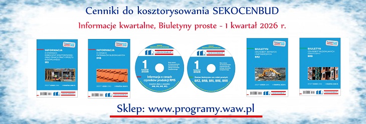 Już są dostępne cenniki Sekocenbud na 1. kwartał 2026 r. Jako pierwsze pojawiły się Informacje kwartalne Sekocenbud RMS na płycie i w wersji książkowej: Informacje o cenach materiałów IMB, IMI, IME i stawkach robocizny i narzutów i cenach sprzętu IRS oraz Biuletyny cen robót - proste: BRZ, BRI, BRE, BRR, BRB.