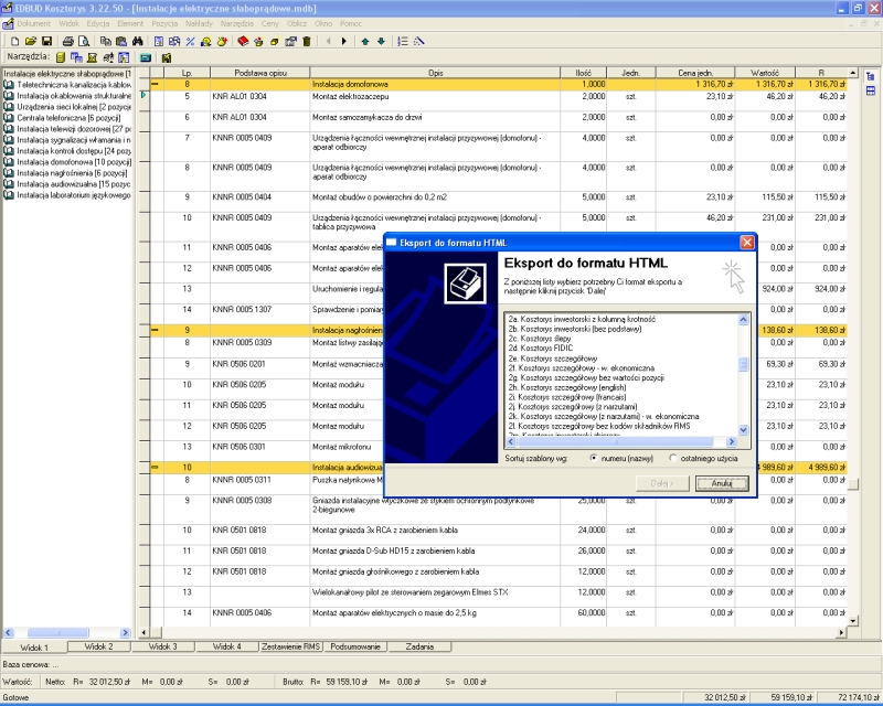 Jeśli użytkownik programu EDBUD Kosztorys chce przesłać kosztorys w wersji elektronicznej osobie, która nie posiada żadnego programu do kosztorysowania, a chce mieć wgląd i możliwość edycji tych danych – może skorzystać z opcji eksportu do formatu HTML. Eksport ten odbywa się w oparciu o gotowe szablony znajdujące się w programie EDBUD. Jest ich kilkadziesiąt, w tym również szablony w języku angielskim i francuskim. Co ważne – lista szablonów ciągle rośnie – gdyż na życzenie klientów wprowadzamy nowe szablony z uwzględnieniem specyfiki i wymagań danej firmy.